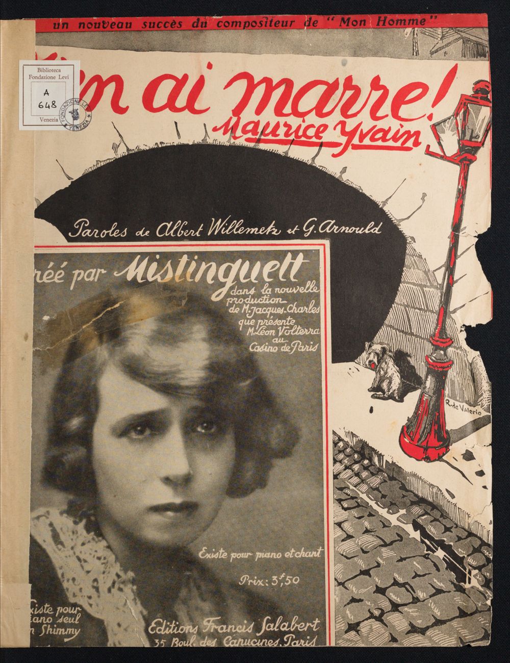 In due spartiti del fondo Levi A compare come soggetto fotografico ritratto Mistinguett (Jeanne Florentine Bourgeois, Enghien-les-Bains, 1875-Bougival, 1956), celebre cantante e attrice francese che si è esibita sui palchi dei music-hall più importanti di inizio secolo come il Moulin Rouge o le Folies Bergère. In J'en ai marre. Créé par Mistinguett (Levi A.0648), composto da Maurice Yvain e pubblicato nel 1921, il riquadro con la fotografia della cantante è chiaramente delimitato dal resto della composizione, come negli esempi sopra citati. Sul piano posteriore, una illustrazione raffigurante l’imbocco di una galleria buia preceduta da un lampione e un cane collocati sul marciapiede, è evidenziata con il colore rosso, oltre al titolo, al nome del compositore e il filetto che separa fotografia e illustrazione. La desolazione del paesaggio urbano, enfatizzata dall’uso del nero e del rosso – pennellato drammaticamente solo in alcuni punti – esprime efficacemente la frustrazione della protagonista per le difficoltà della vita quotidiana (J'en ai marre è traducibile come “Ne ho abbastanza”).