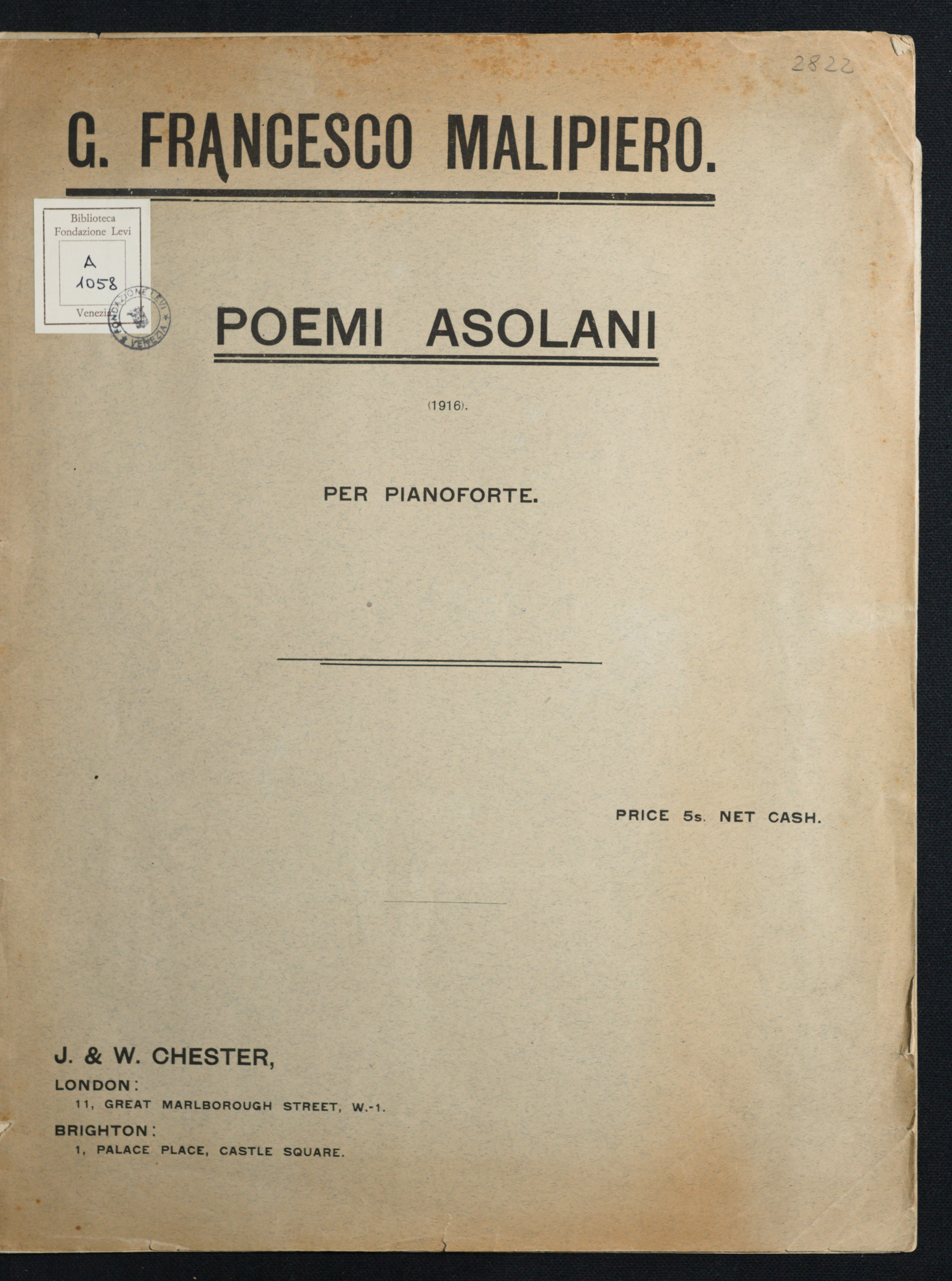 Poemi asolani (1916) : per pianoforte / G. Francesco Malipiero. - London : J. & W. Chester, c1918. - 16 p. ; 34 cm. ((In testa alla prima p. di mus. dedica: A Henry Prunieres , 1916
