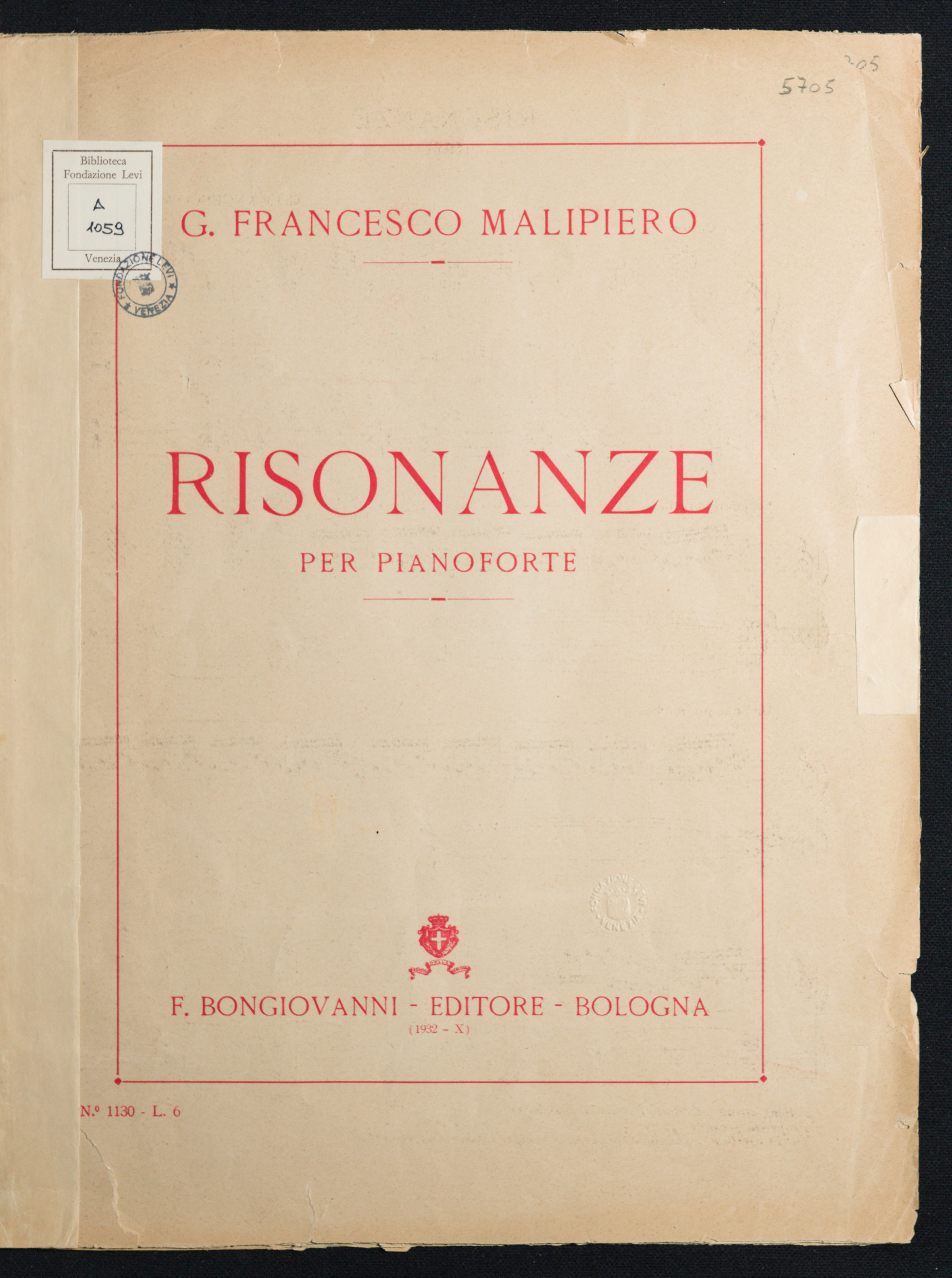 Risonanze : per pianoforte / Francesco G. Malipiero. - Bologna : Bongiovanni, 1932. - 9 p. ; 33 cm , 1932