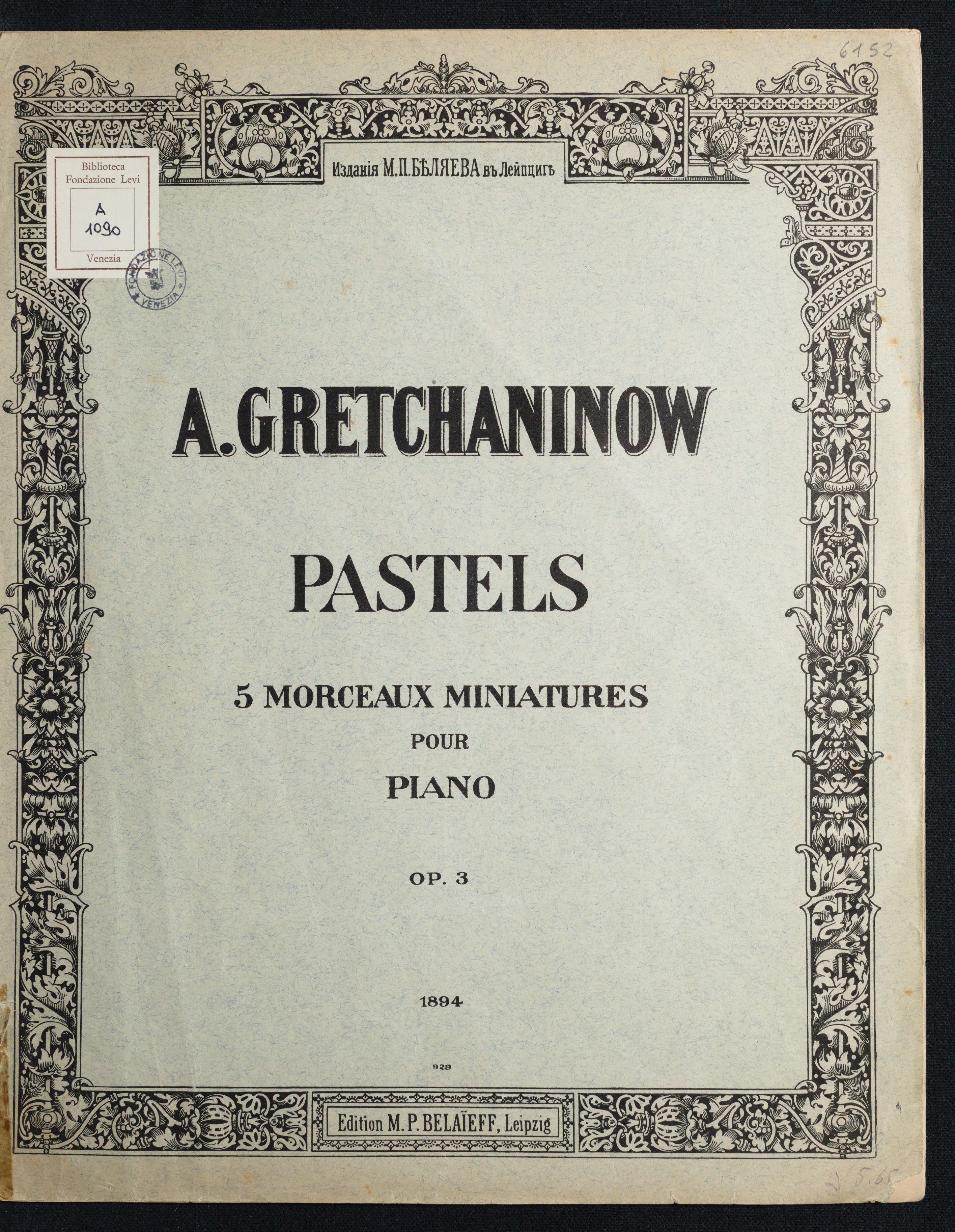Pastels : cinq morceaux miniatures pour piano : op. 3 / par A. Gretchaninow. - Leipzig : M.P. Belaieff, 1894. - 15 p. ; 32 cm. ((Contiene: Plainte ; Meditation ; Chant d' automne ; Orange ; Nocturne. , 1894