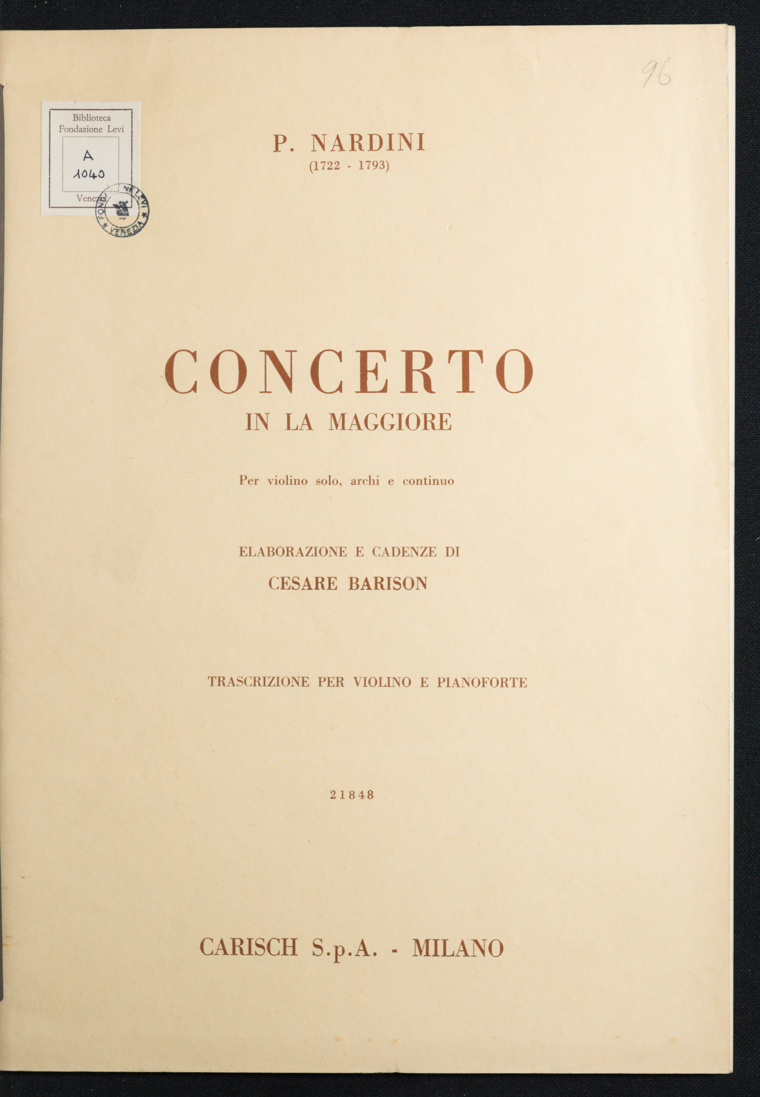 Concerto in la maggiore per violino solo, archi e continuo : trascrizione per violino e pianoforte / P. Nardini ; elaborazione e cadenze di Cesare Barison. - [Spartito e parte]. - Milano : Carisch, c1970. - 1 spartito (38 p.) ; 34 cm + 1 parte (9 p.) , 1970